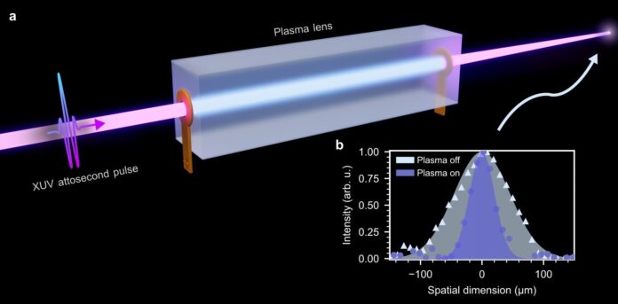 Команда исследователей преодолела эту проблему, разработав новую плазменную линзу. Процесс включает в себя воздействие мощных электрических импульсов на водородный газ, заключенный в крошечный сосуд. Это быстро лишает атомы водорода электронов, создавая плазму — состояние вещества, в котором электроны отделены от атомов. Электроны естественно расходятся наружу, образуя плазменную структуру, напоминающую вогнутую линзу.